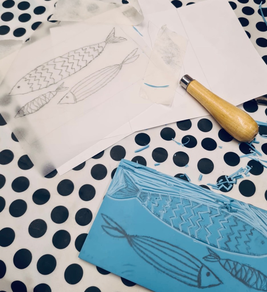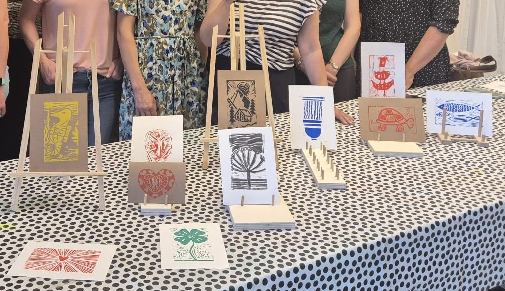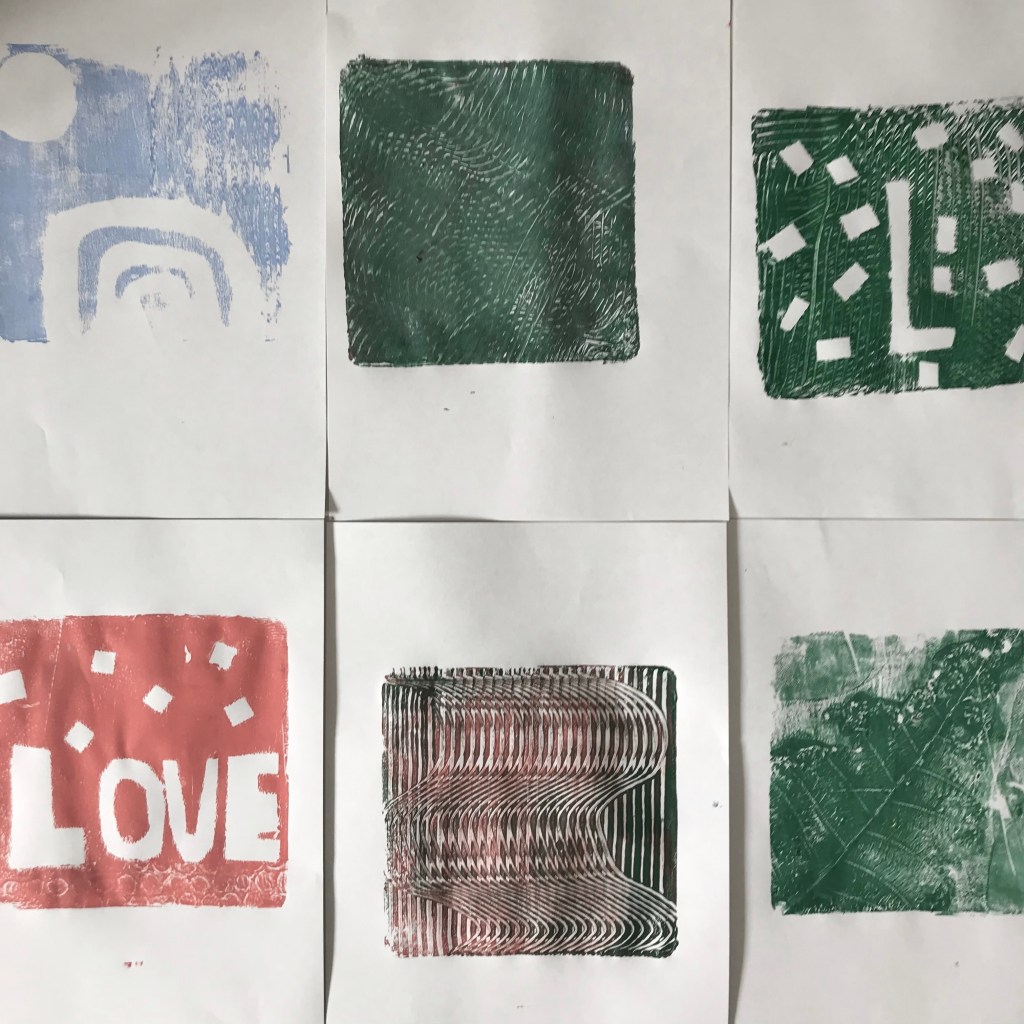 Een aantal mooie prenten op papier. Jouw linoleum stempel kun je meenemen om later eventueel nog meer te bedrukken. Van iets maken word je blij en helpt je om te ontspannen.