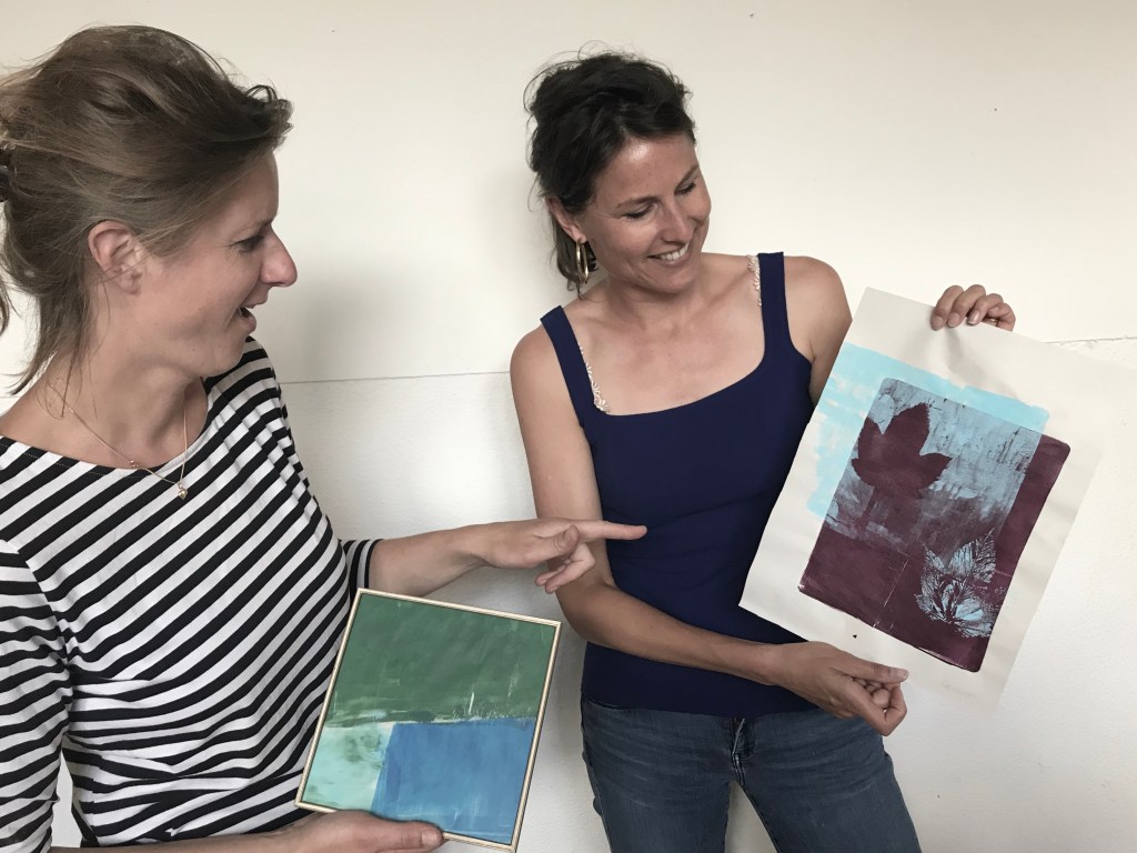“Mijn overtuiging dat ik zelf niets kan maken, kon ik na deze middag laten varen, haha. Na een korte uitleg van Karin konden we zelf aan de slag. En konden we intuïtief van alles creëren. Die flow leverde verrassende prints en af en toe ook mooie mislukkingen op.